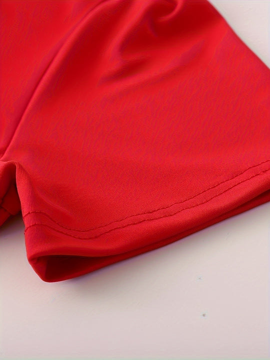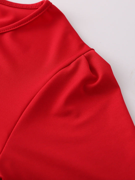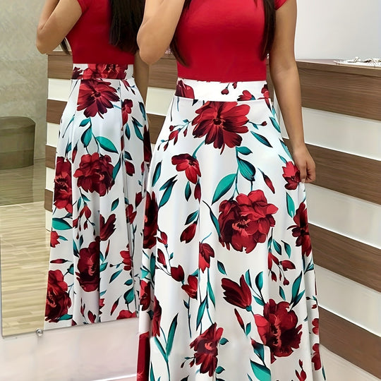 Women'S Plus Size Floral Print Red Colorblock Midi Dress with Short Sleeves