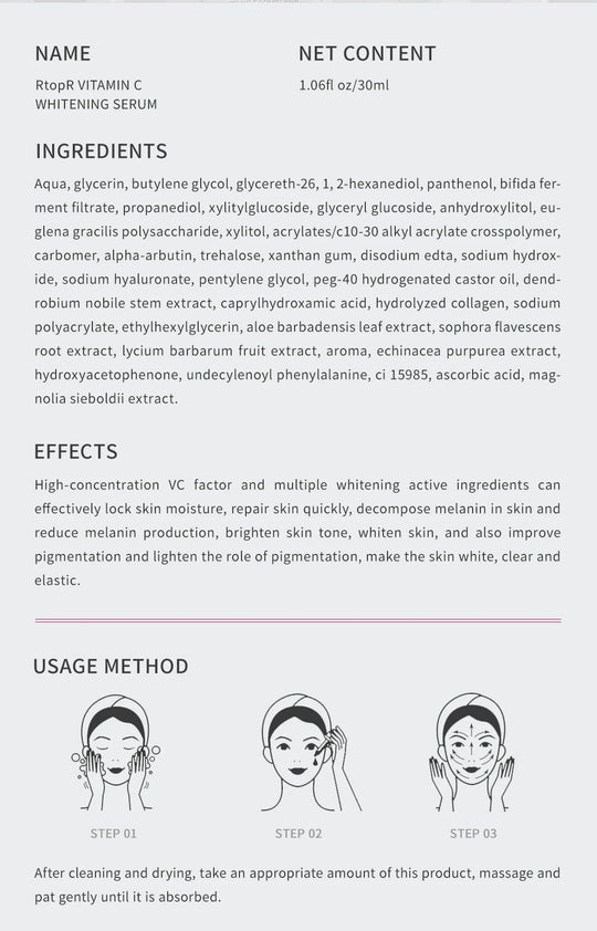 SPECIFICATIONS Brand Name: RtopR Country/Region of Manufacture: CHINA EFFECT: Repair Skin,Brighten Skin Colour Feature: Whitening Formulation: Liquid Gender: Unisex High-concerned chemical: None Ingredient: bifida ferment filtrate Item Type: face serum Model Number: RtopR045 Number of Pieces:...Regular price £15.99Regular price £15.99 -
